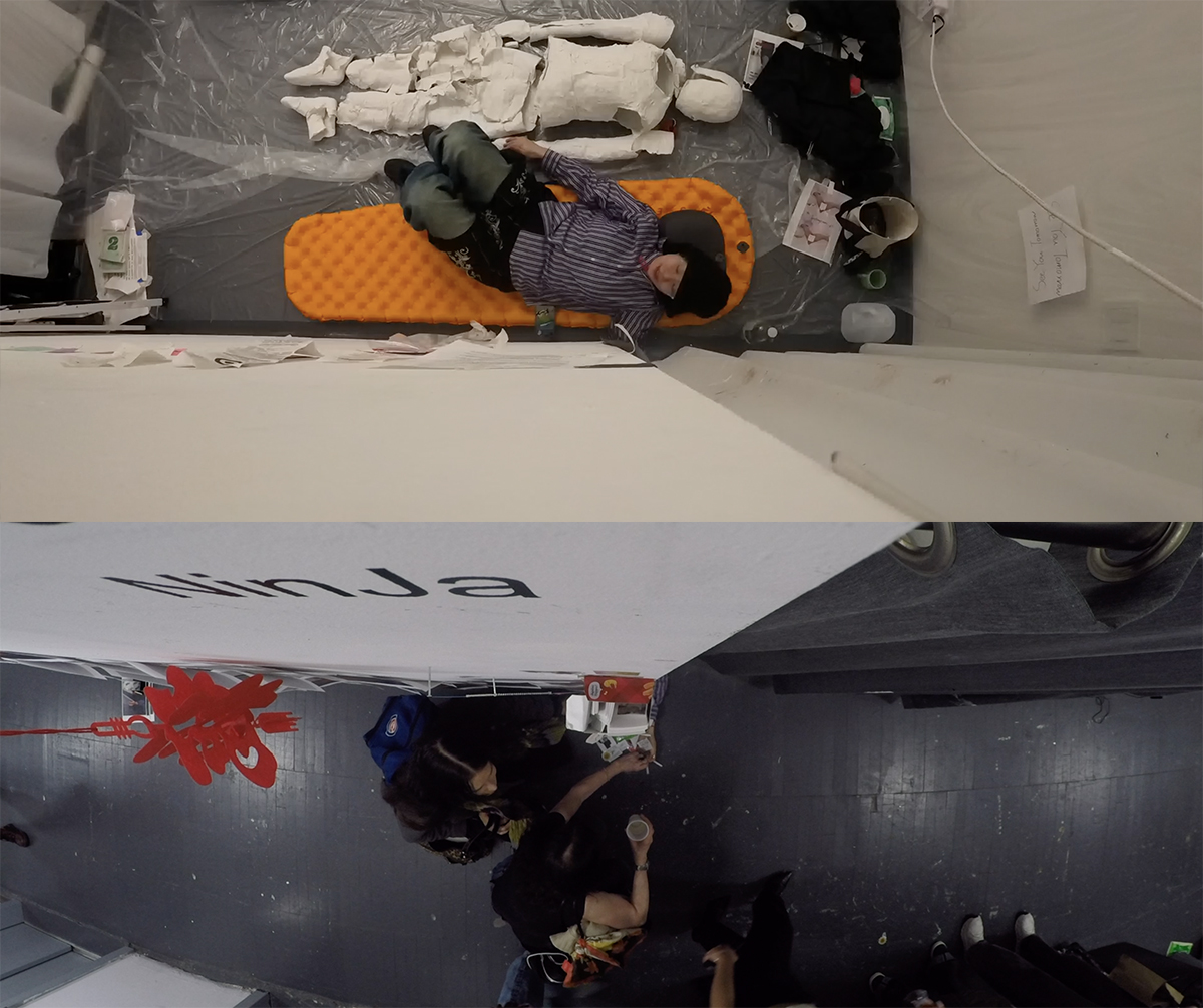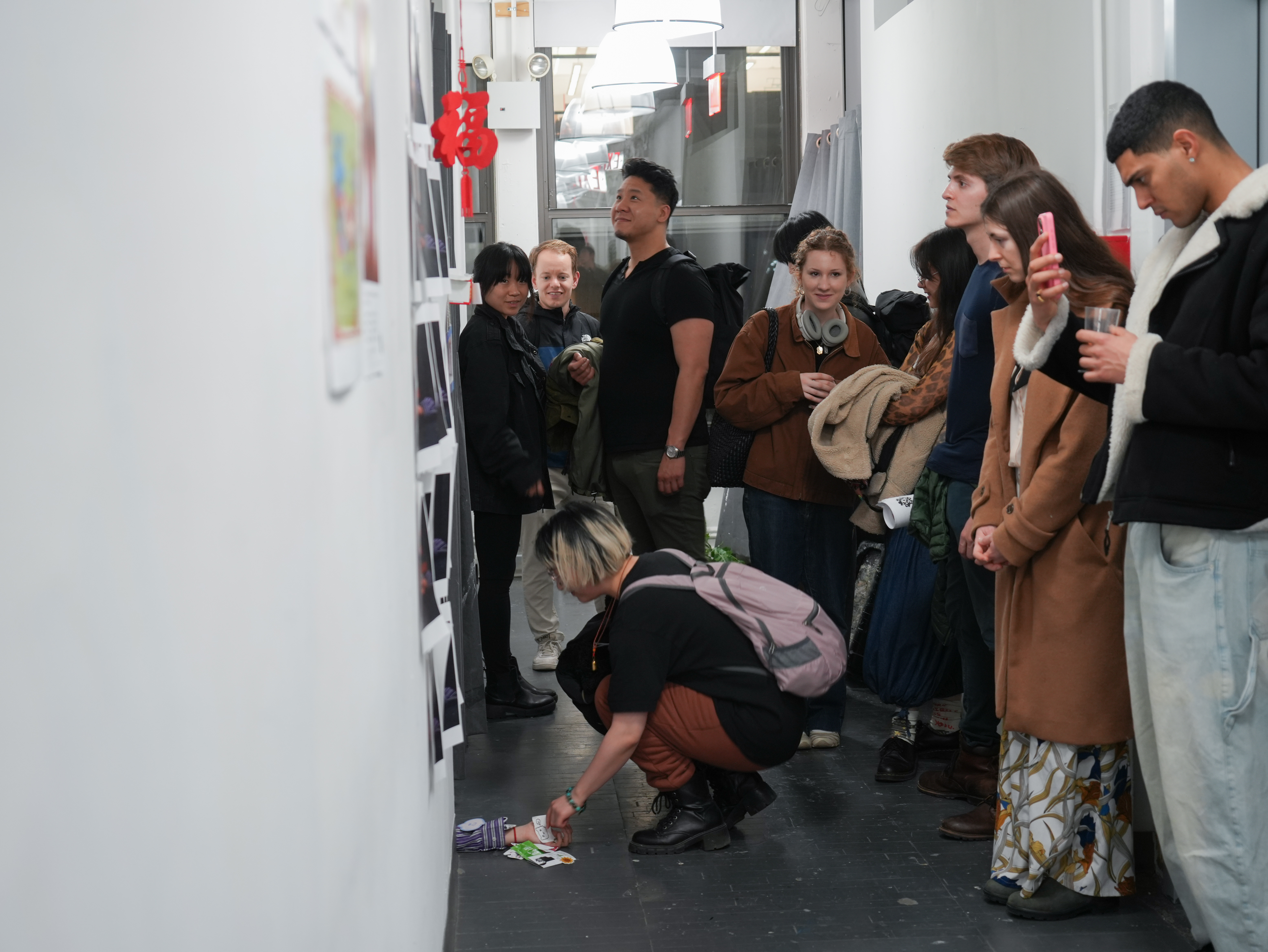 I often make work that responds directly to a particular place or moment. The spring open studio offered a chance for me to experiment with something I often do when I’m alone in the studio: lying on the floor, quietly extending my hand beyond the curtain, and waiting. What happens when a hand — empty and offered — becomes an interlocutor? What might it mean to ask for things out loud, publicly, and with a simple gesture?